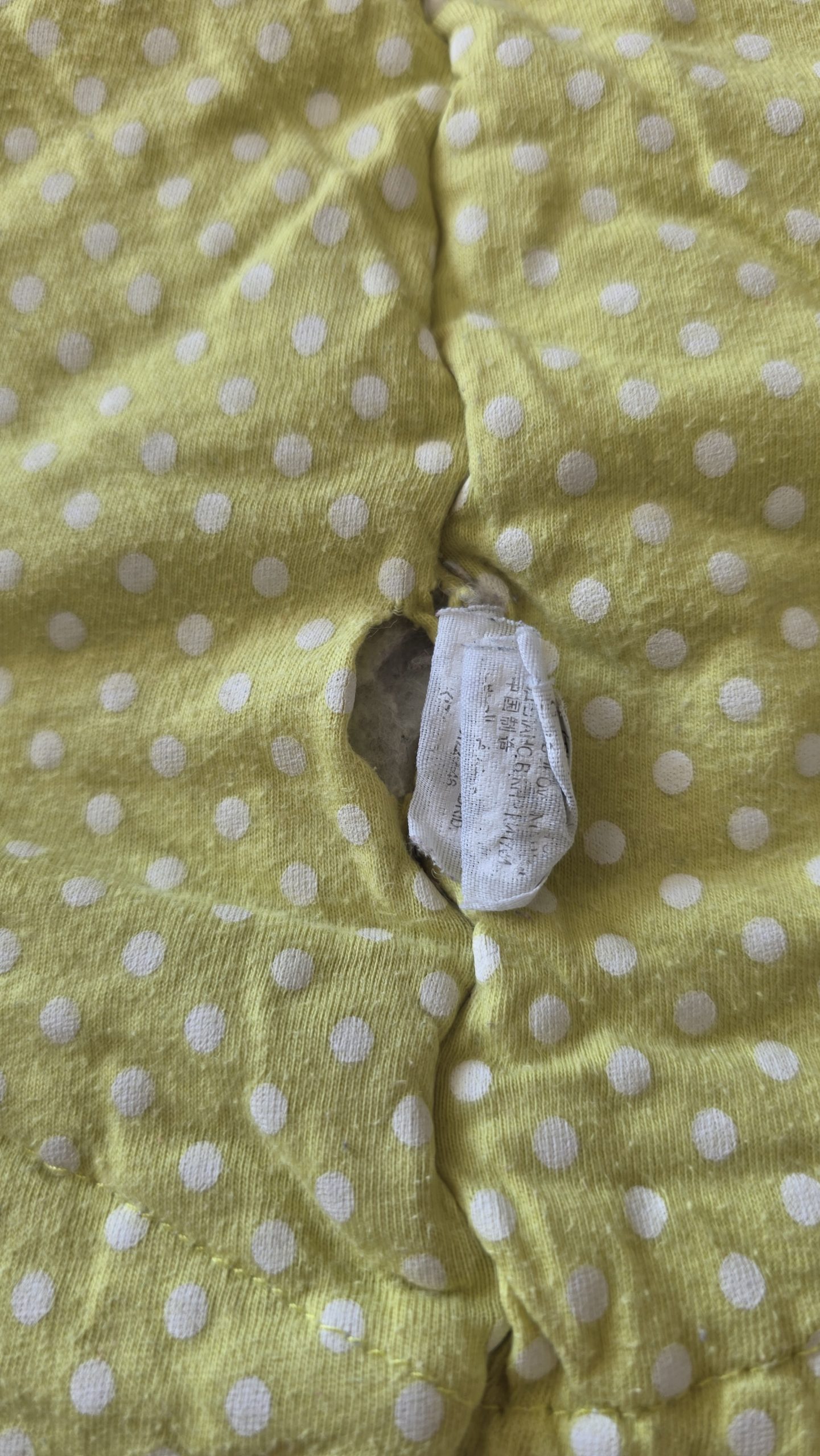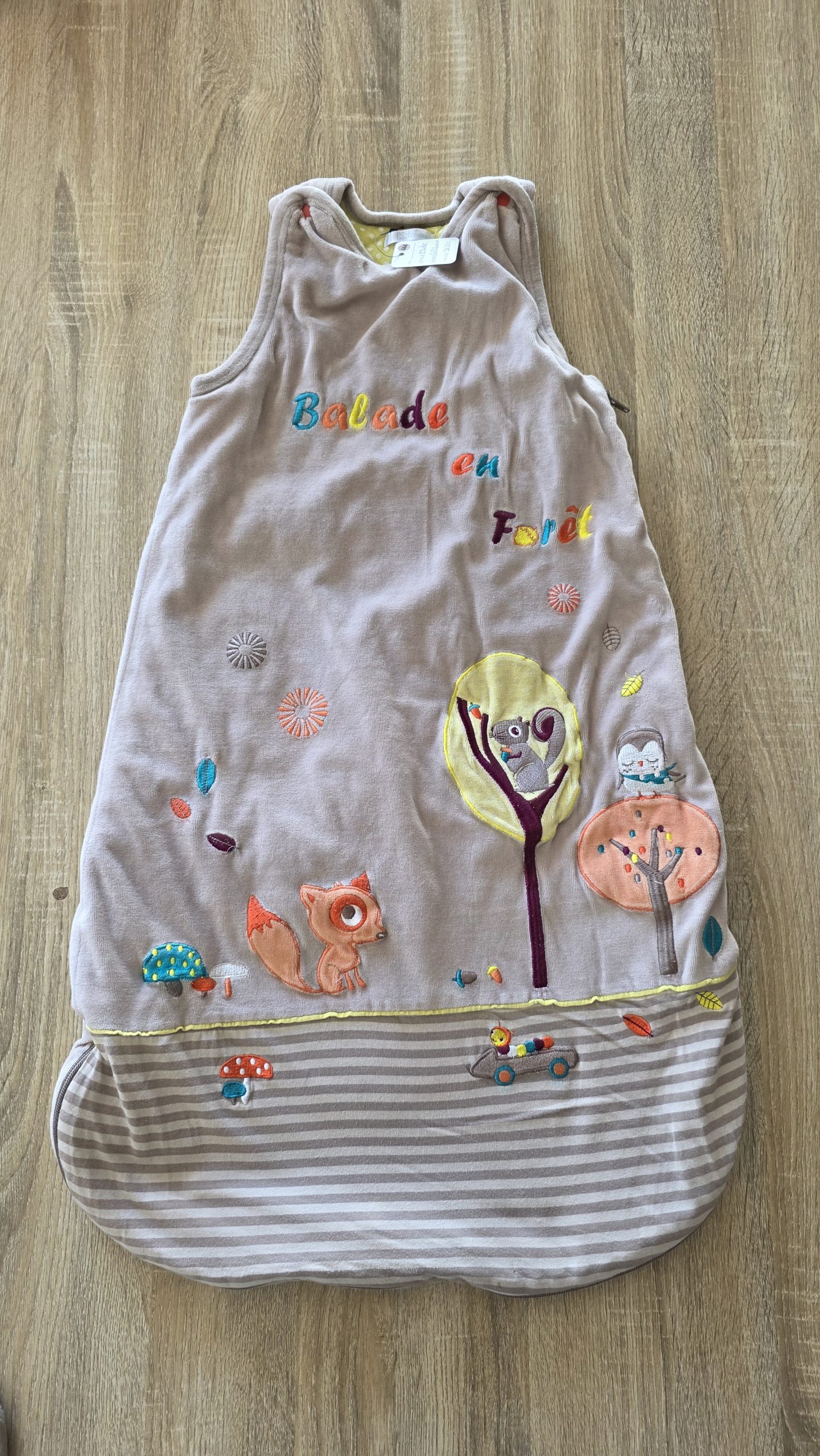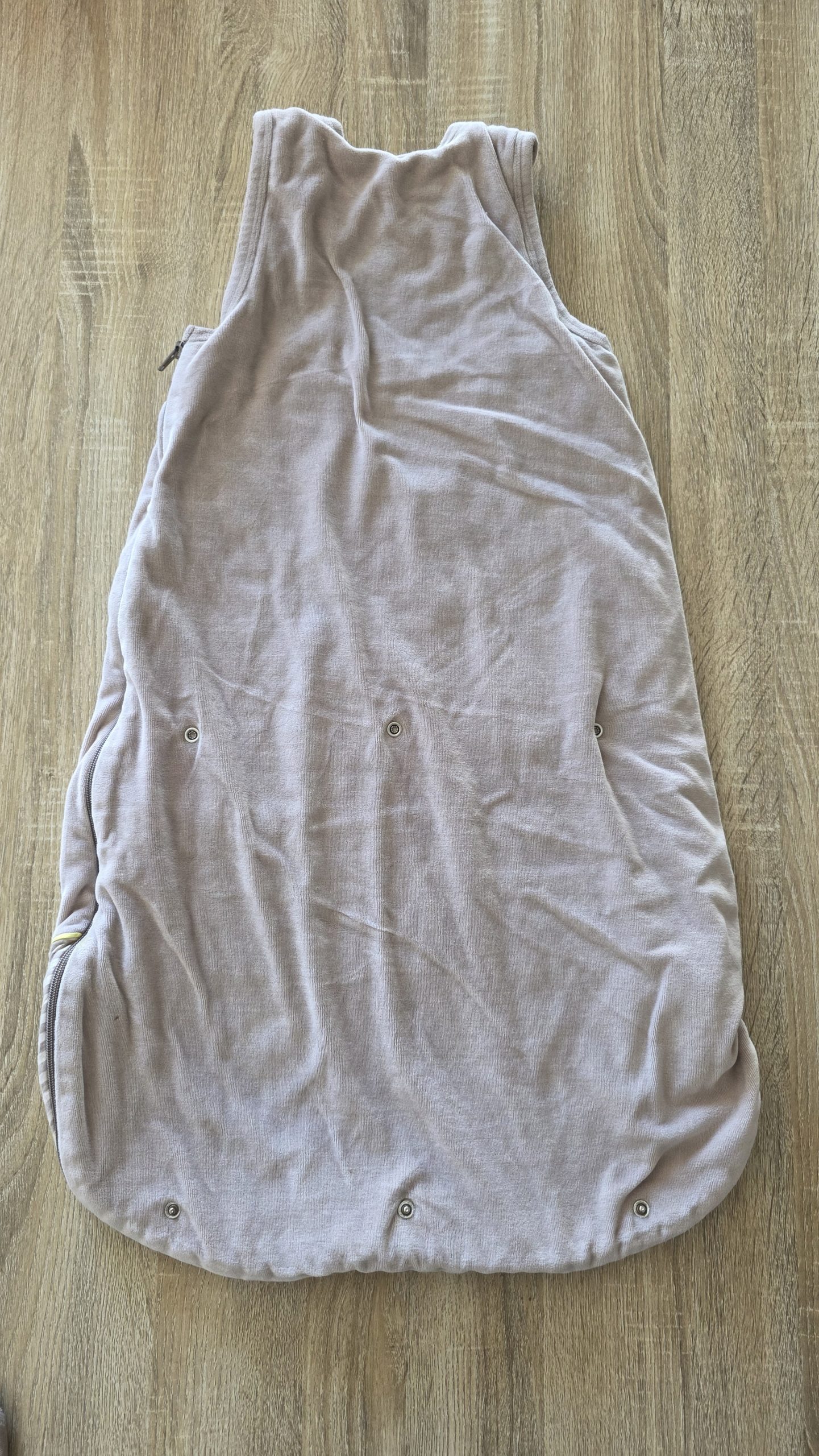 Gigoteuse sans manche de couleur brun. Il y a un trou à l’intérieur. La taille est réglable grâce au bouton de pression a l’arrière