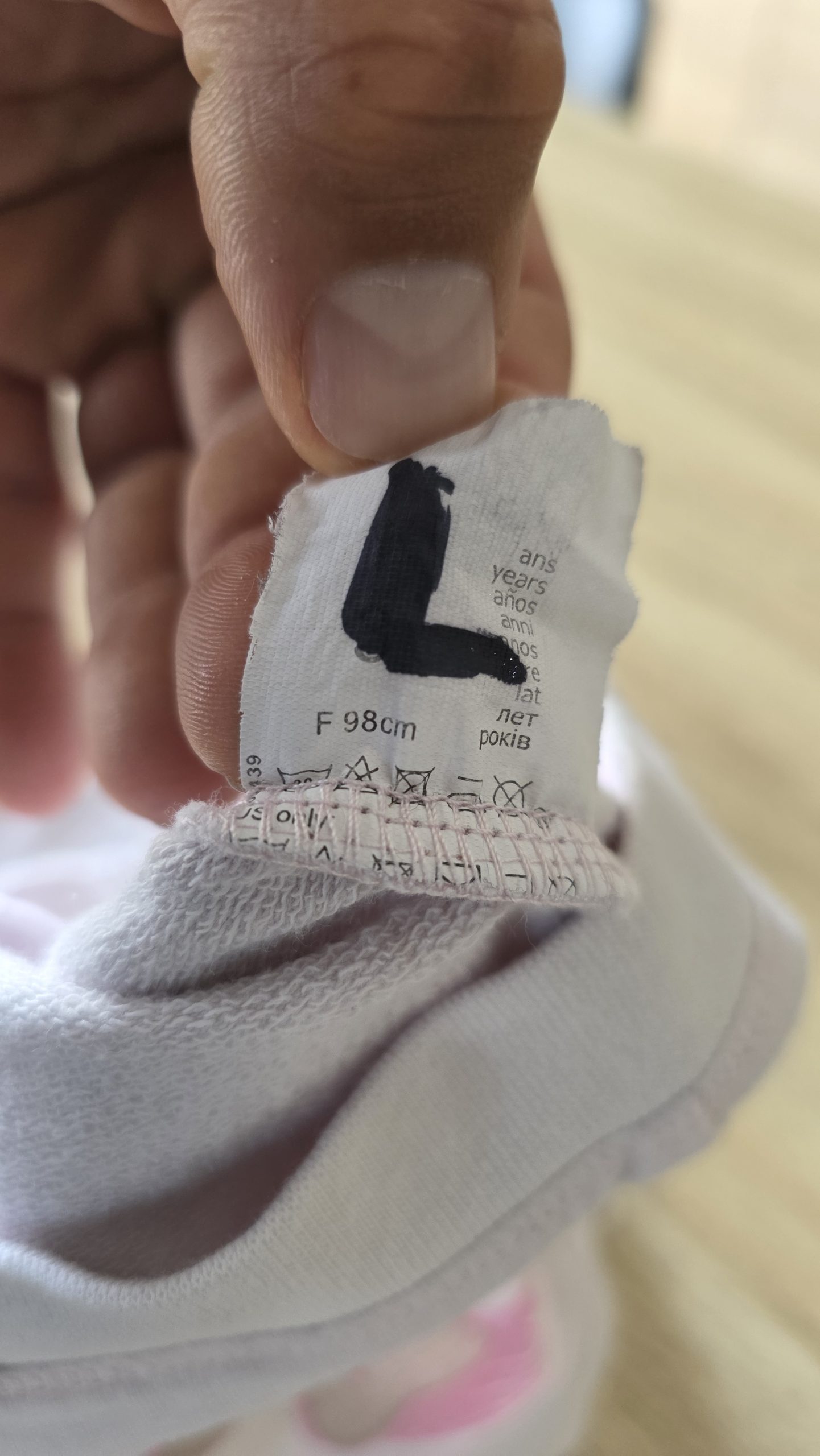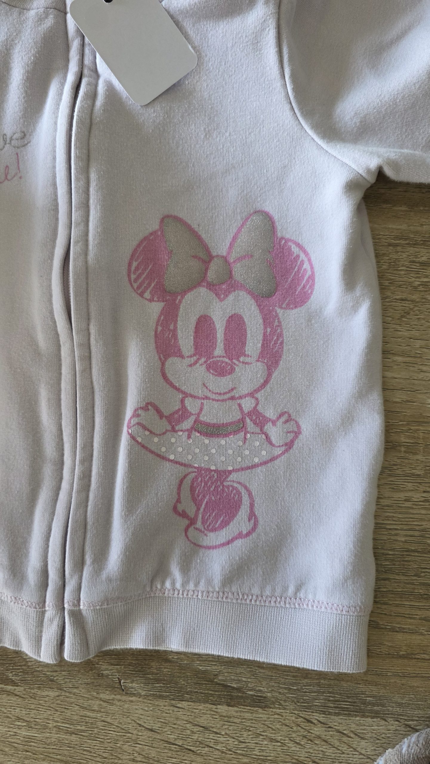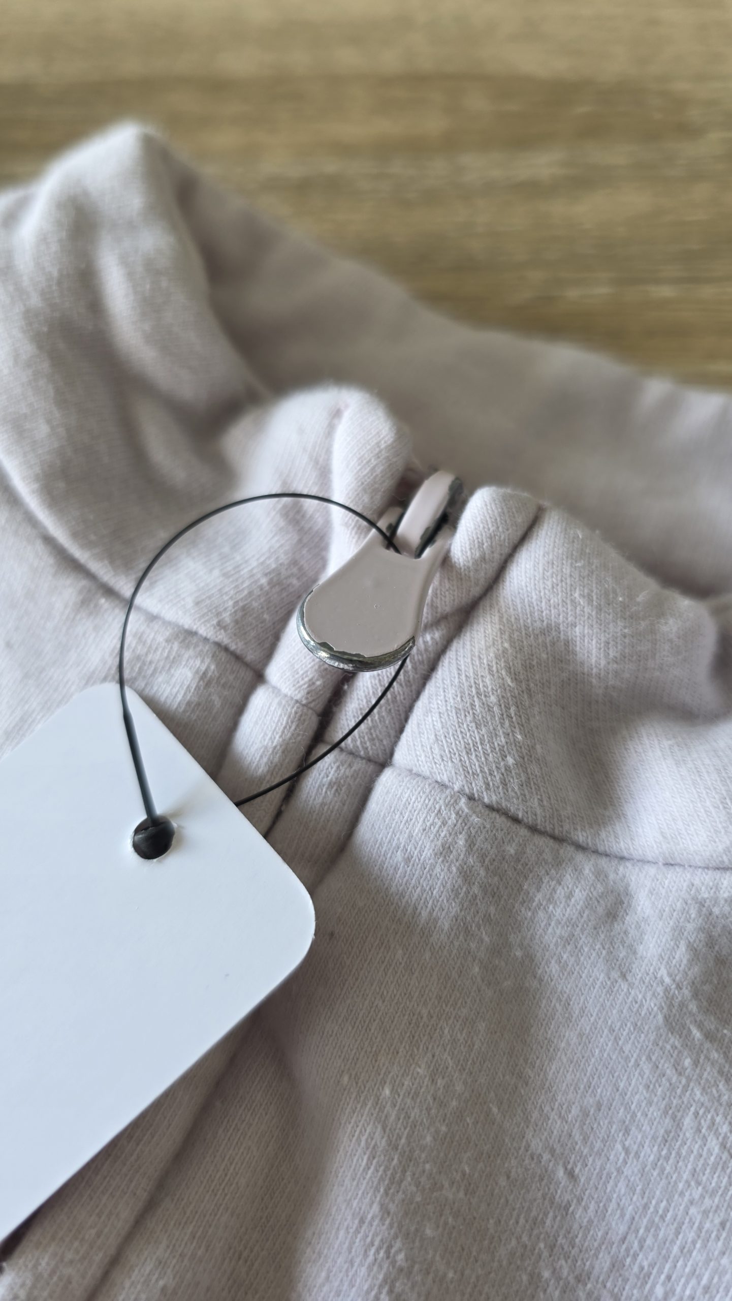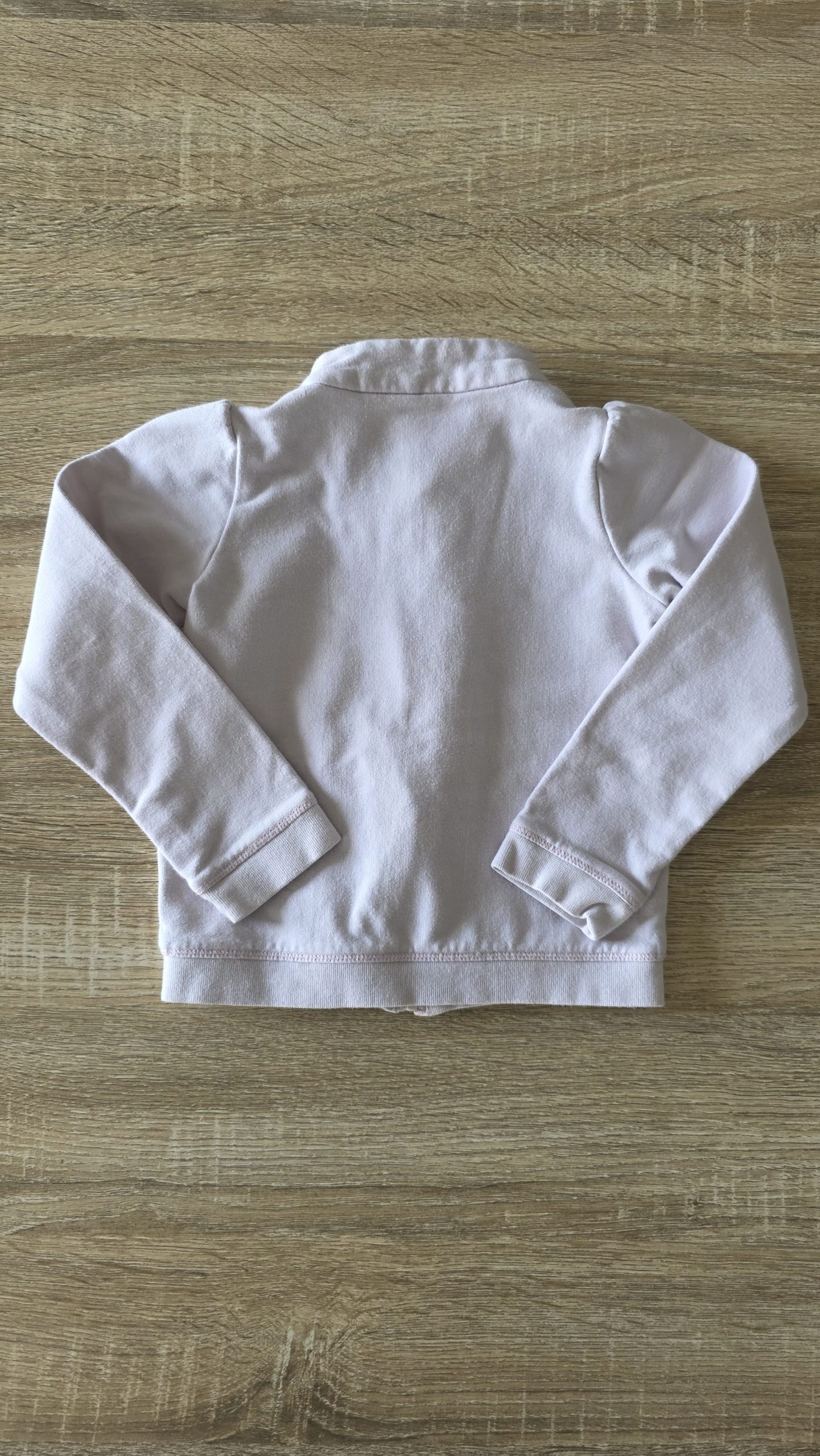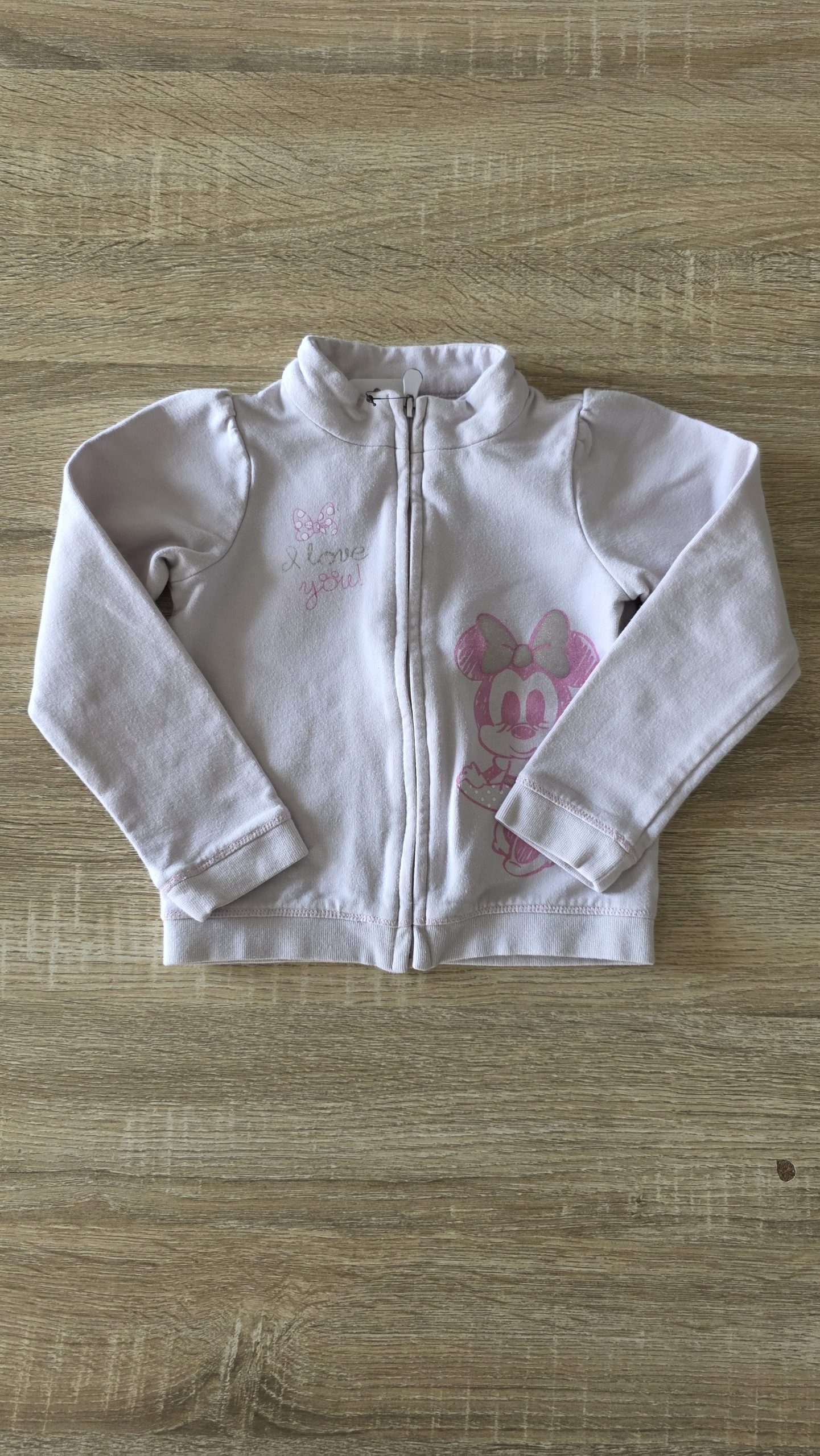 Gilet de couleur rose clair. Bon état général, l’écriture s’efface légèrement, la fermeture éclair a la couleur qui s’enlève et une tâche à l’arrière