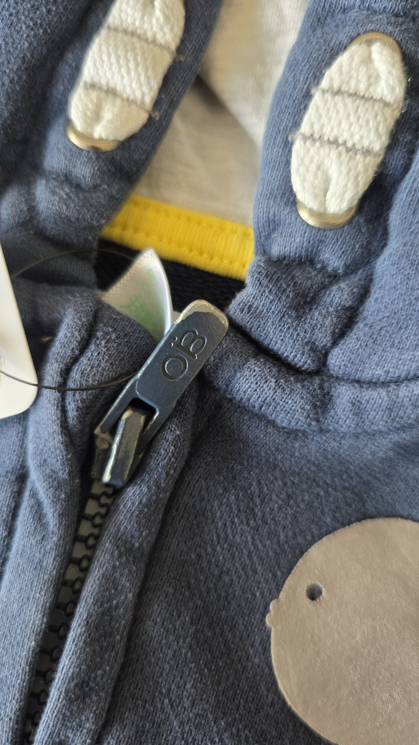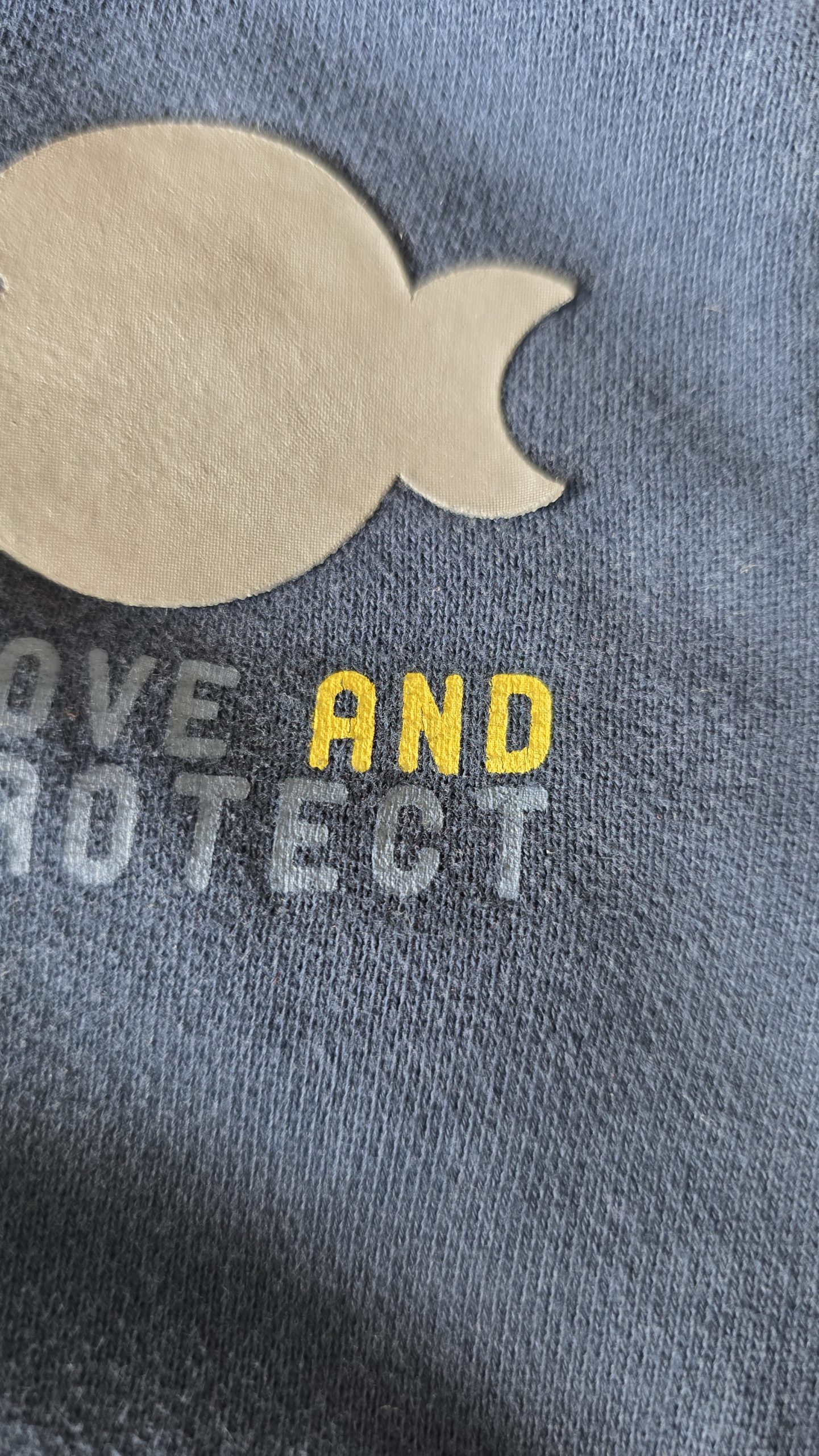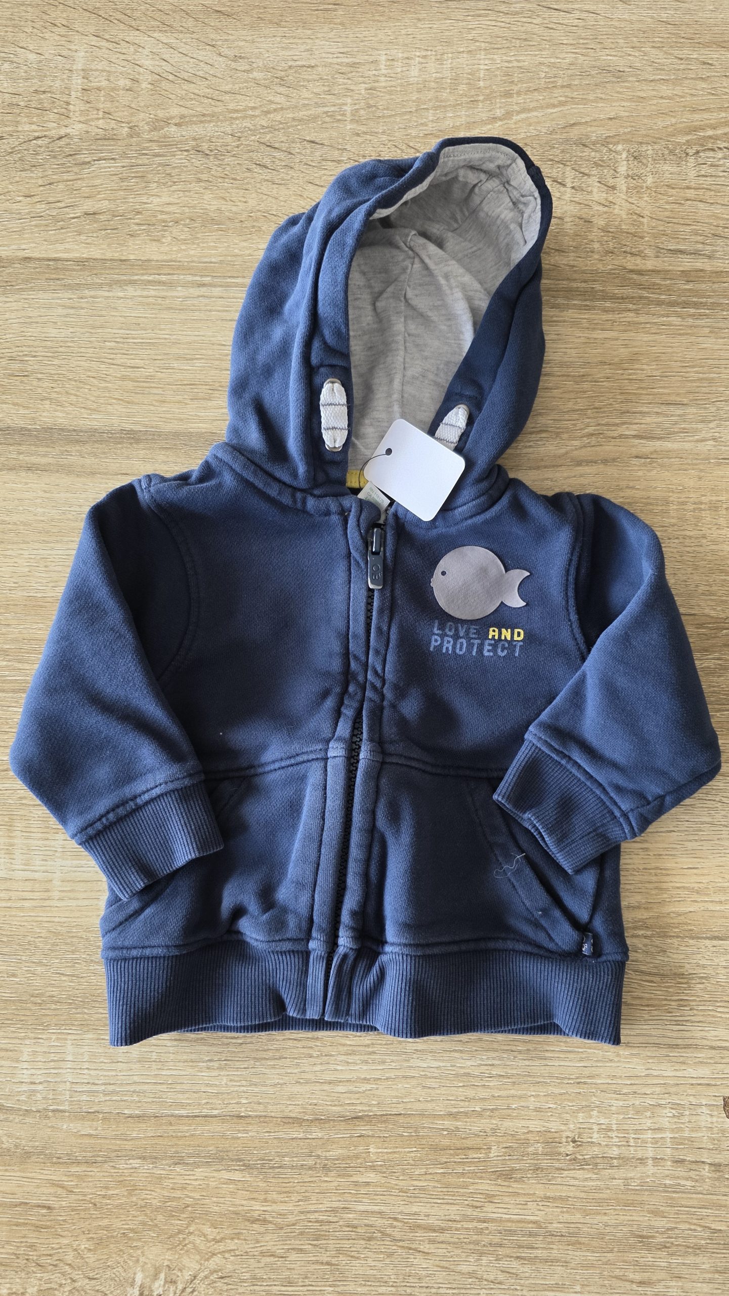 Gilet à capuche de couleur bleu. Le mot ” and ” est légèrement craquelé, et la fermeture éclair à la couleur qui s’enlève