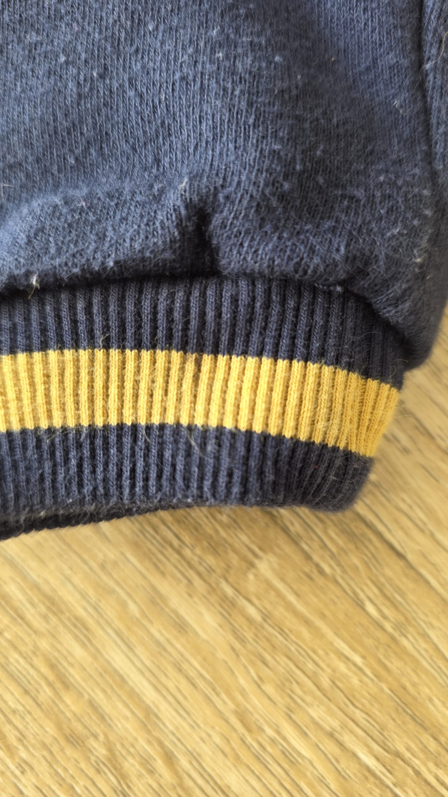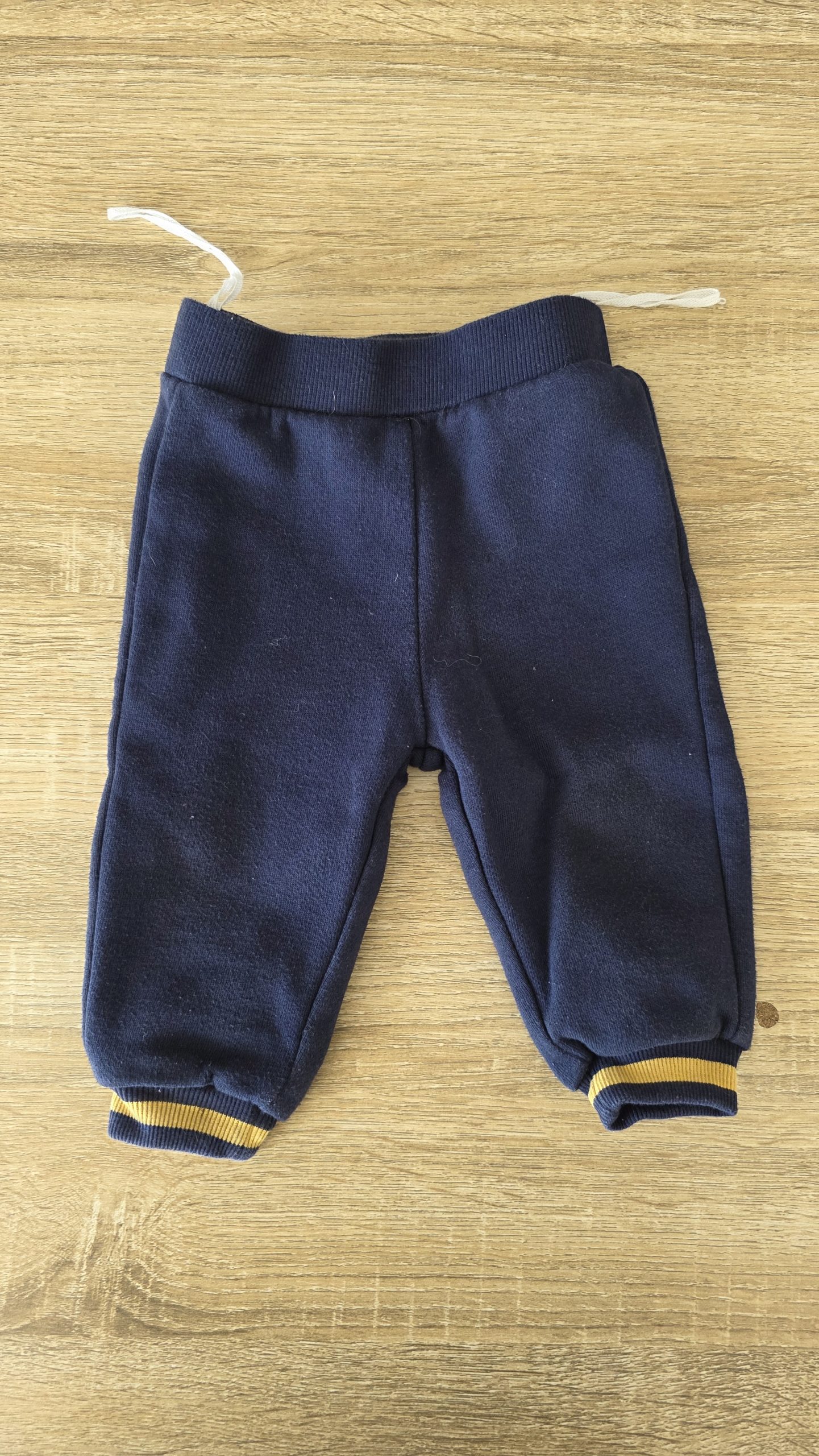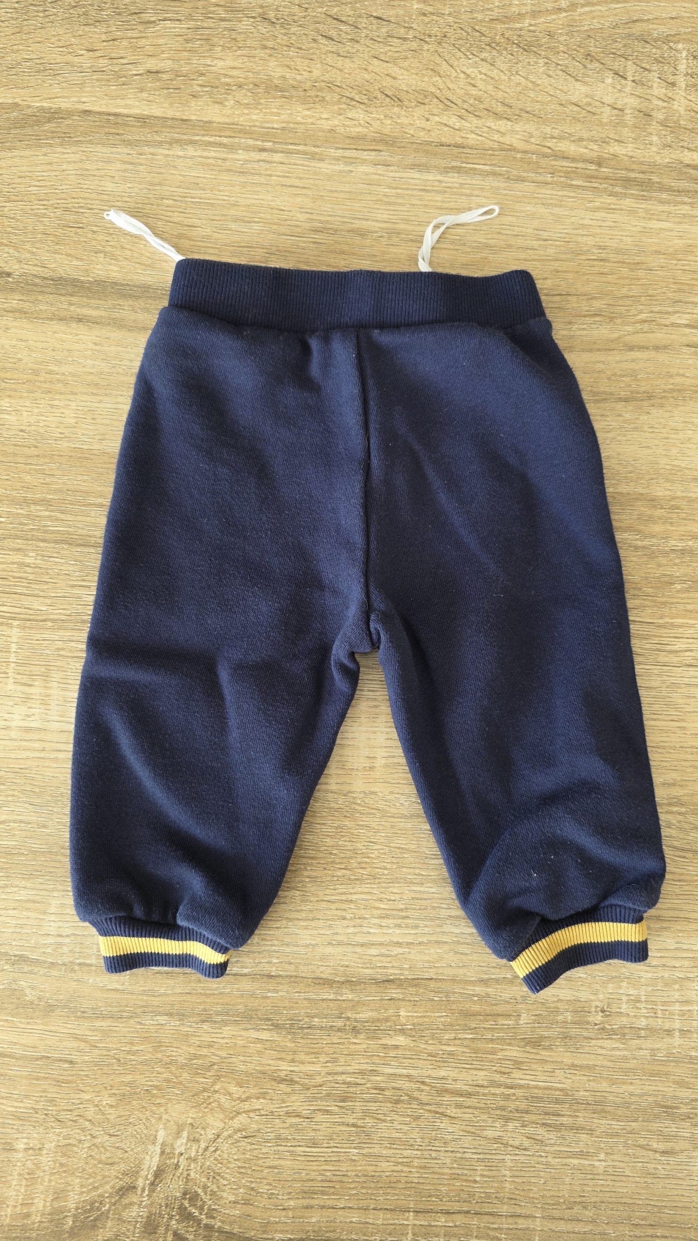 Bas de jogging de couleur bleu. Légèrement boulocher et sur le bas au niveau du trait jaune une toute petite tâche