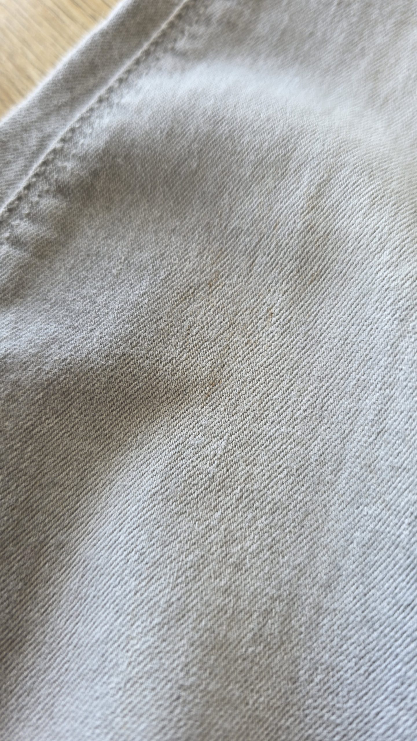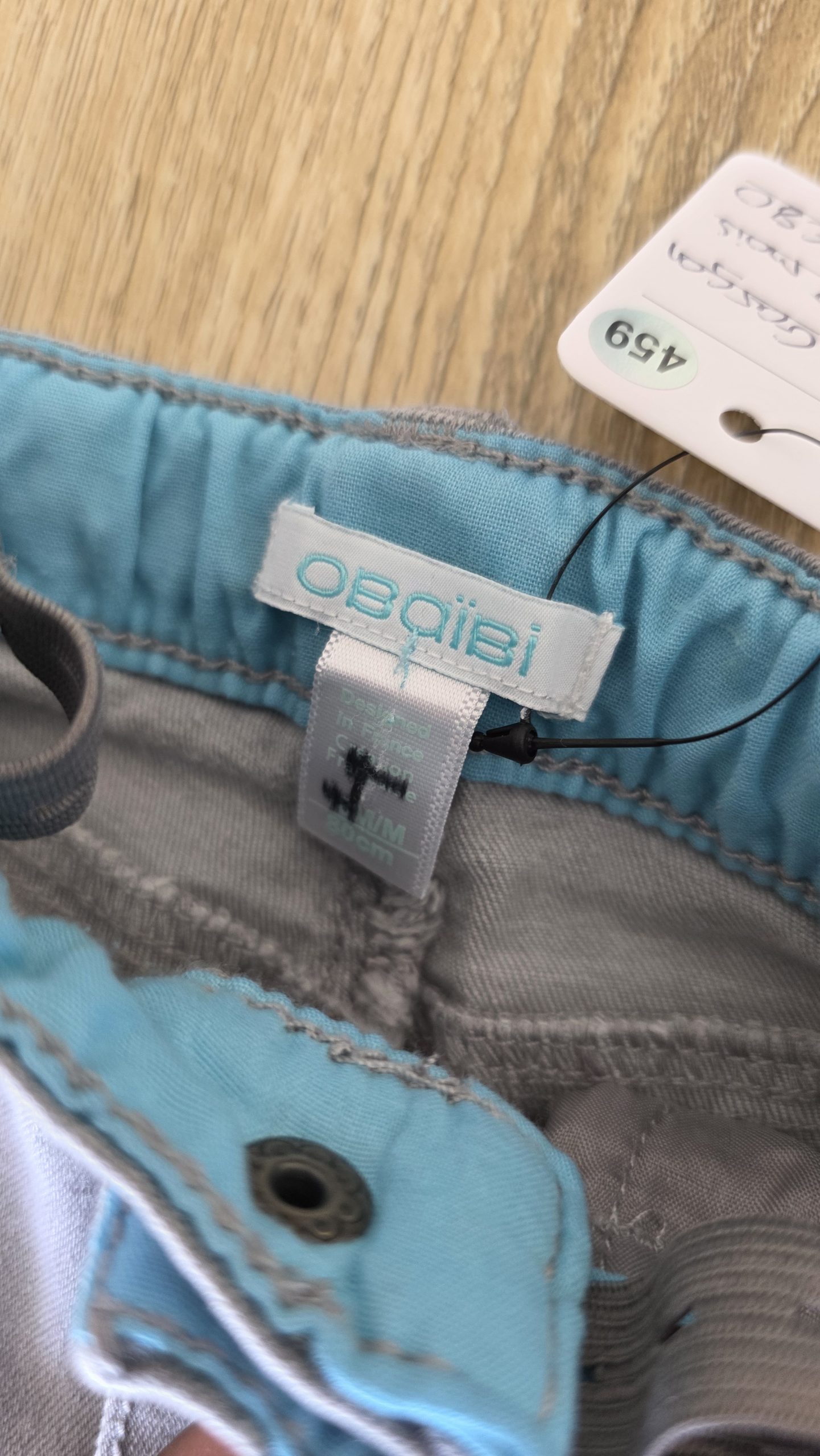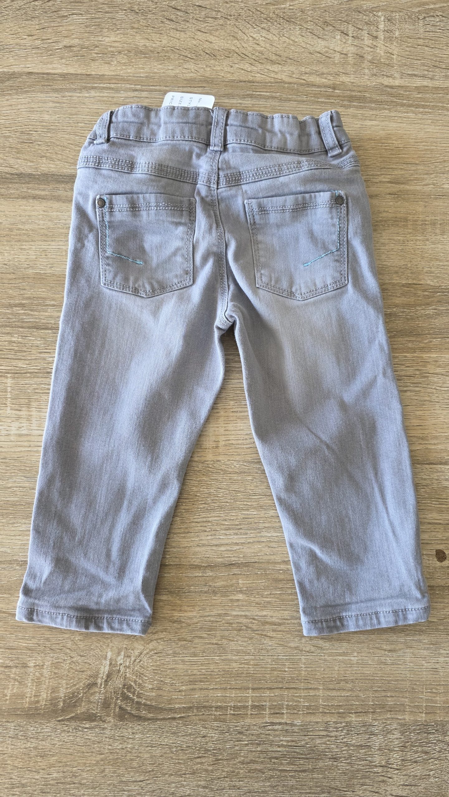 Pantalon de taille réglable de couleur gris. Il a des petites tâches au niveaux des jambes