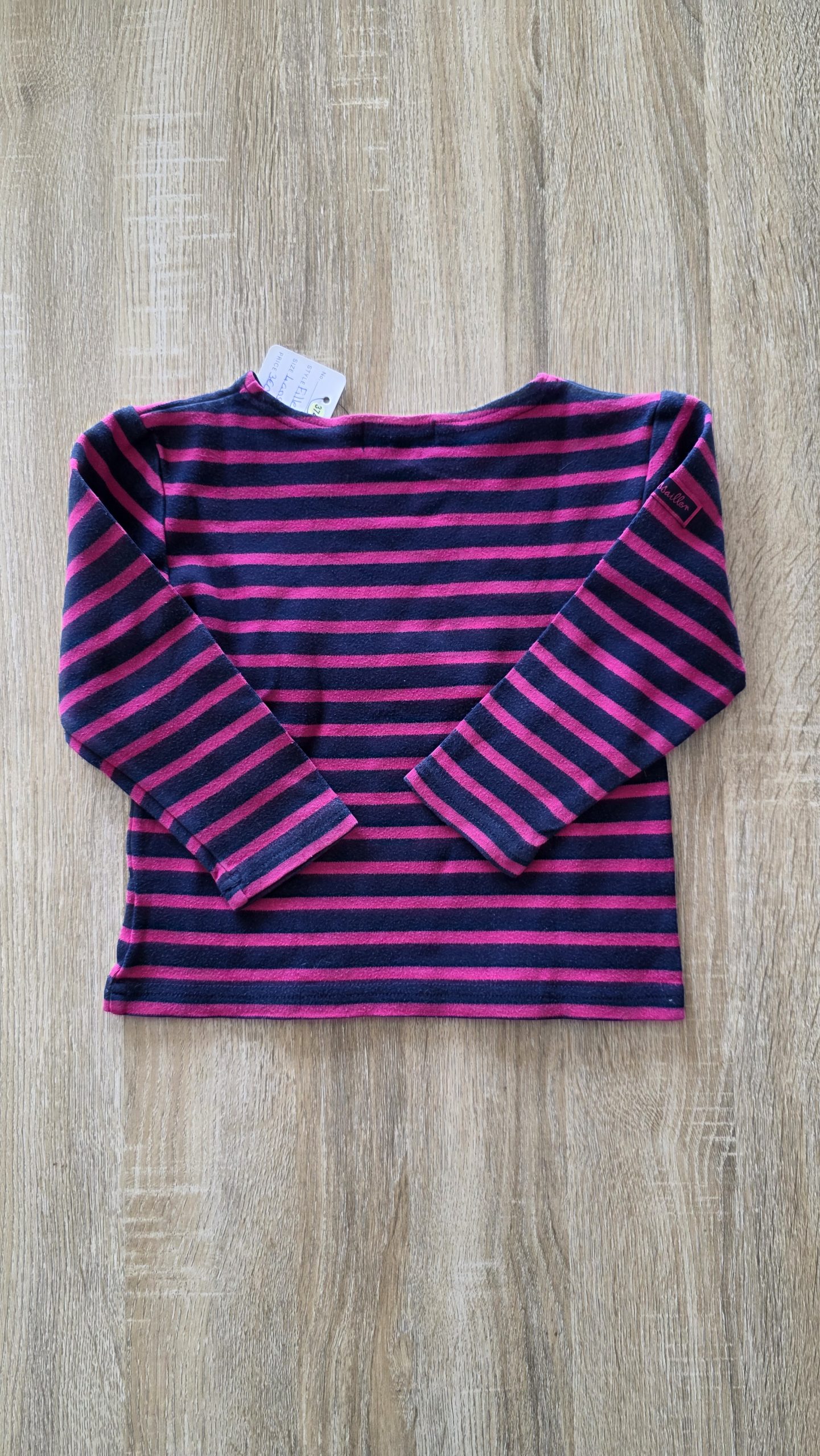 Pull avec rayure bleu marine et rose fushia.