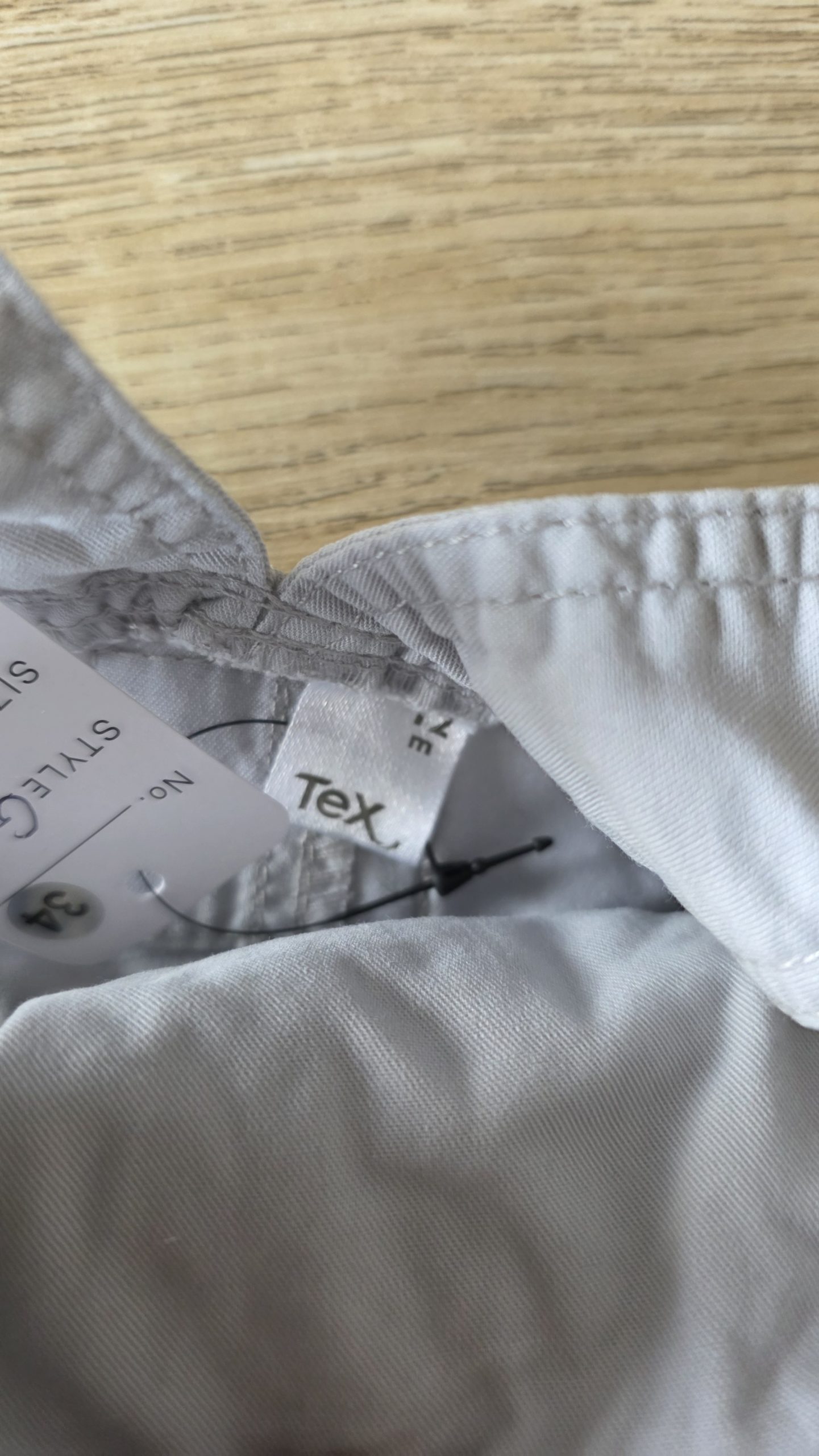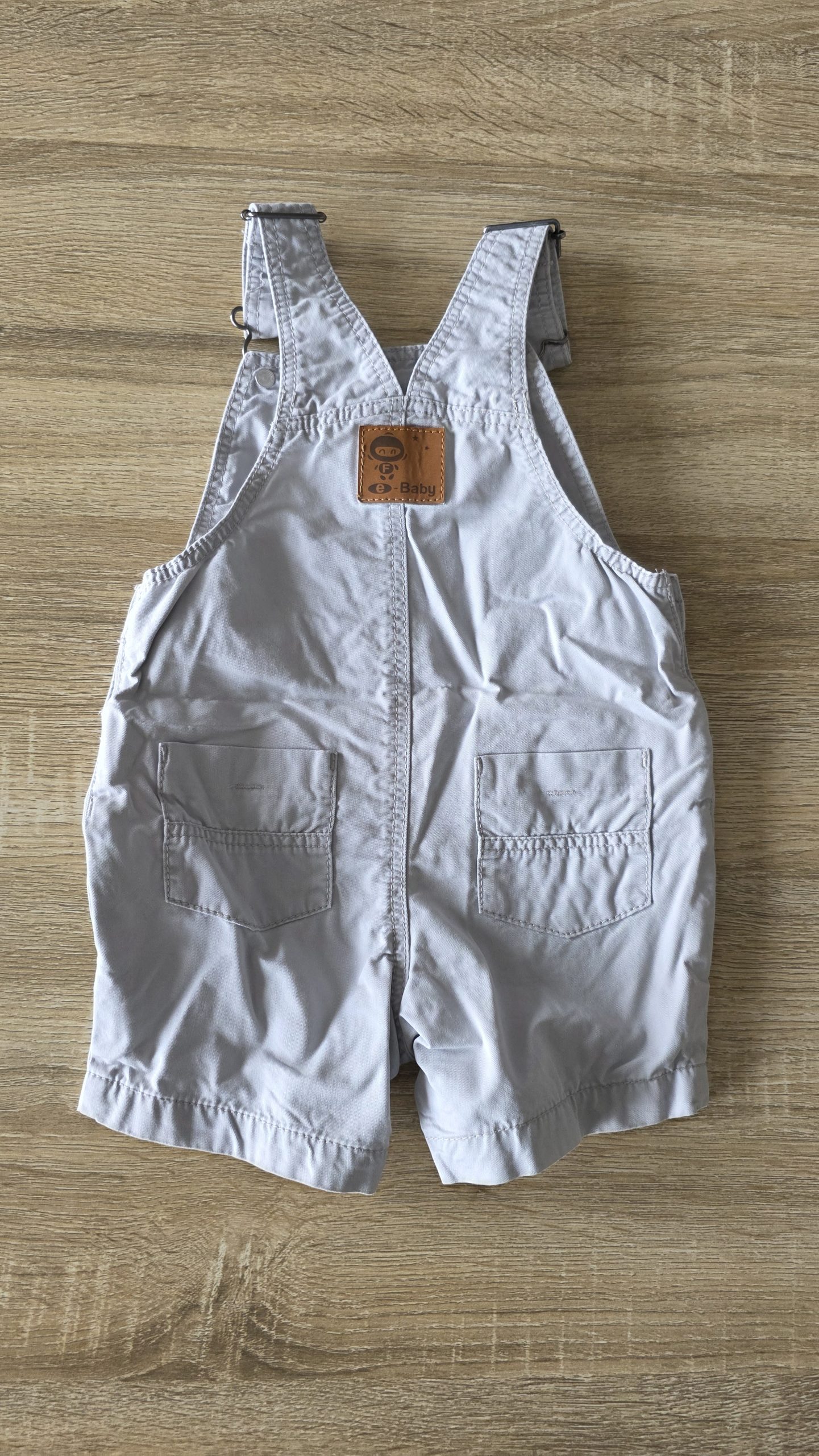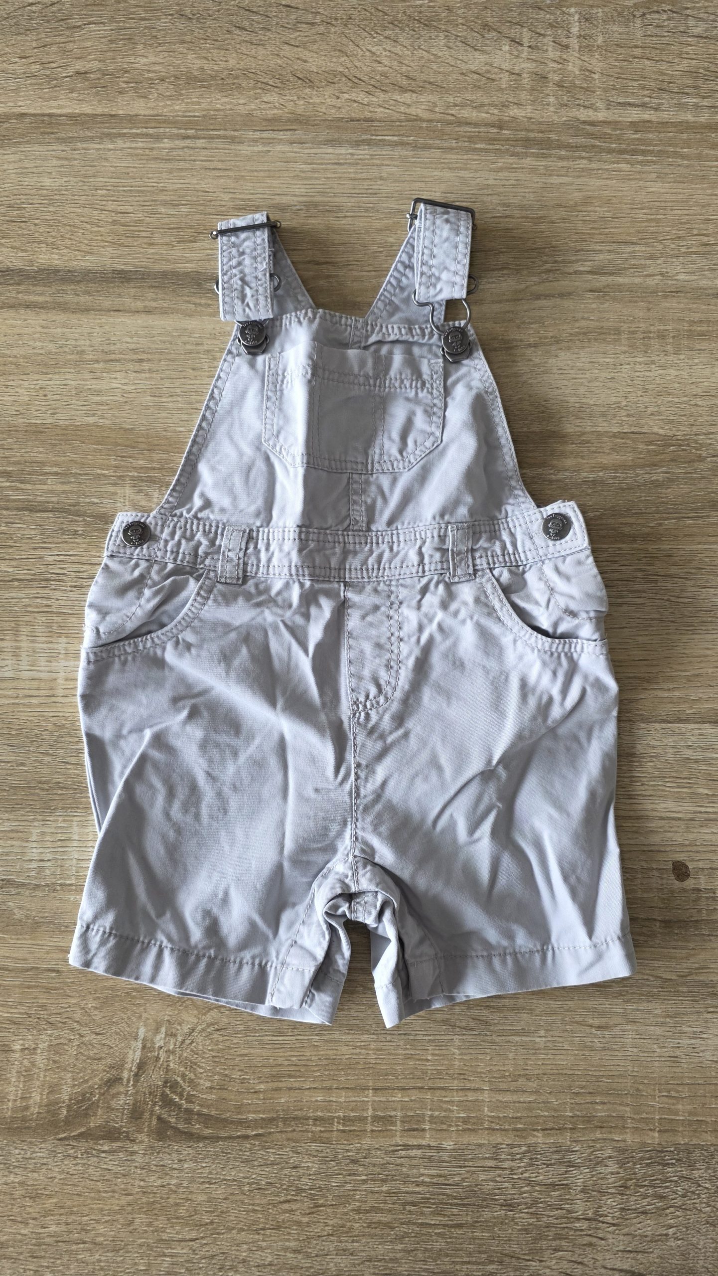 Salopette de couleur gris clair. Bouton décousu en bas