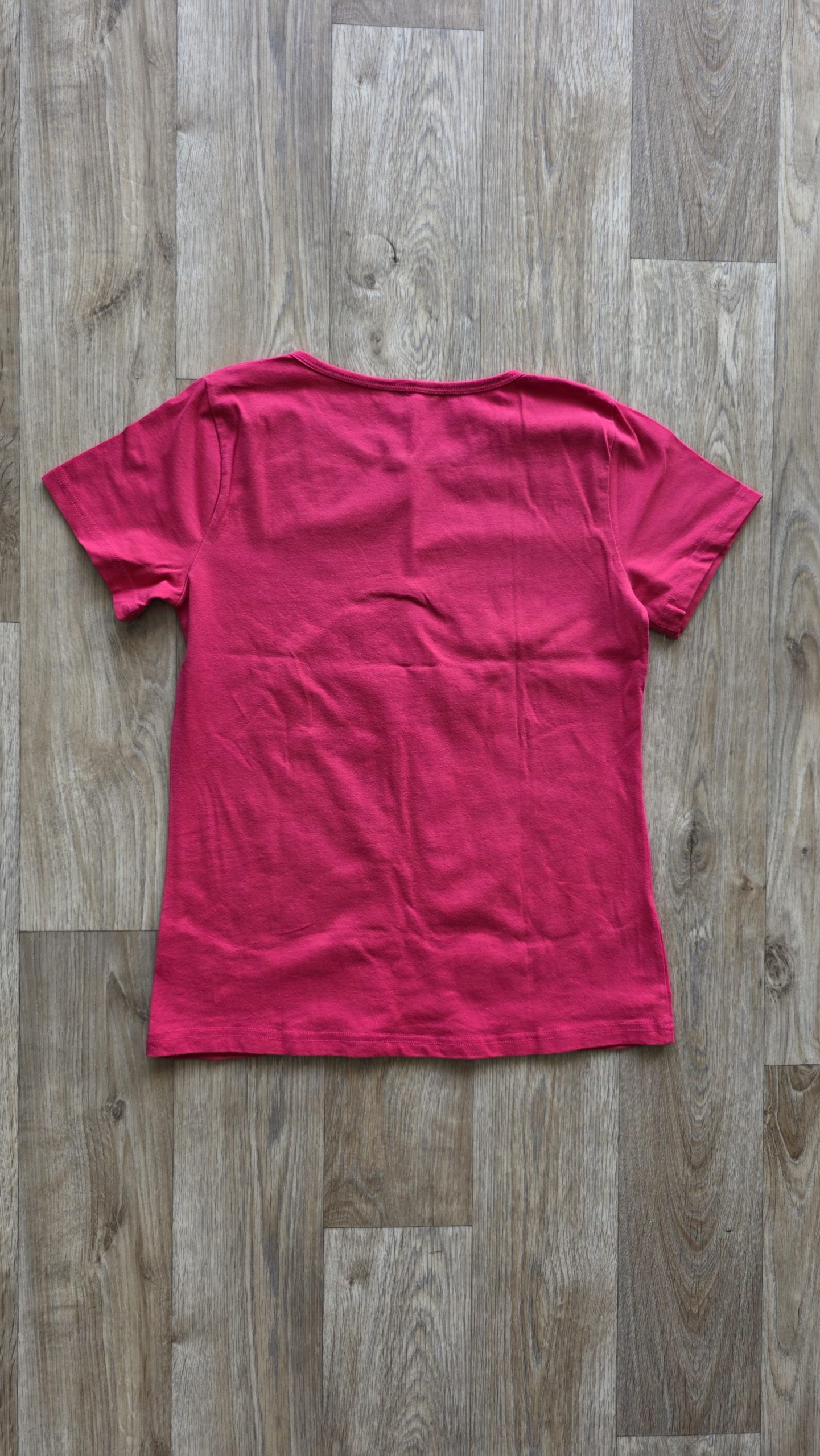 T-shirt de couleur rose, l’image est un petit peu craquelée + petit trou